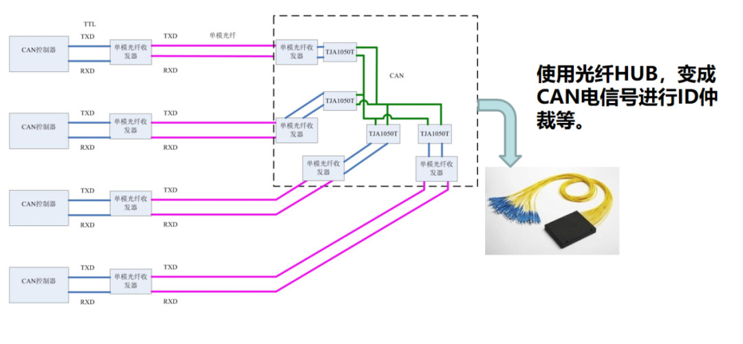 - 優(yōu)點(diǎn):光纜可以遠(yuǎn)傳,并且不會(huì)被干擾和雷擊;使用光纖HUB,維持CAN的各種特性,實(shí)時(shí)性強(qiáng)。