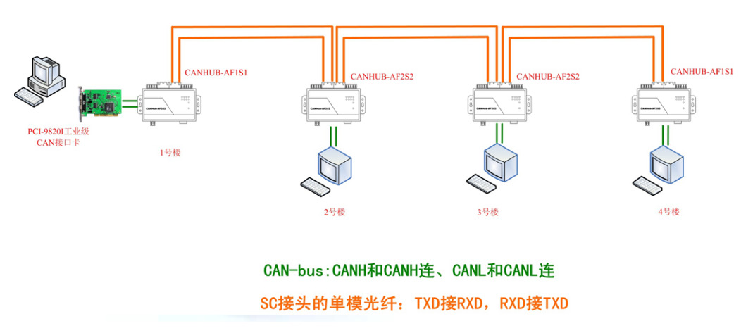 光纜組網(wǎng)拓?fù)浞绞?/div>隨著CAN總線的應(yīng)用越來越廣泛,原本的雙絞線傳輸方式雖然可以減少干擾對(duì)通訊傳輸?shù)挠绊?,但在需要高可靠性的環(huán)境中,仍然不能完全滿足。隨著抗干擾的需求增加,光纜組網(wǎng)也隨之普及。