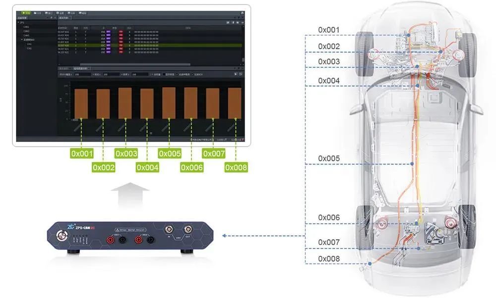 新一代汽車電子架構(gòu)覆蓋了車載以太網(wǎng)、CANFD以及LIN總線,因此,我們需要不同的測(cè)試方法,來完成汽車和車載網(wǎng)絡(luò)的設(shè)計(jì)、驗(yàn)證、調(diào)試、排查以及維護(hù)。如果可以在PC端通過ZPS-CANFD汽車電子測(cè)試平臺(tái)獲取汽車的CANFD網(wǎng)絡(luò)以及LIN總線的數(shù)據(jù)進(jìn)行測(cè)試分析,將大大降低汽車整體架構(gòu)測(cè)試的周期,提高工程師研發(fā)及測(cè)試的效率,排查整車故障。