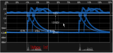 顯性電平通過電阻電容進行放電,但阻抗匹配影響下降沿的快慢程度。下降沿過緩時,將導致位時間異常,引發(fā)總線錯誤。