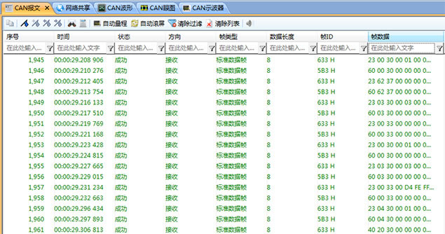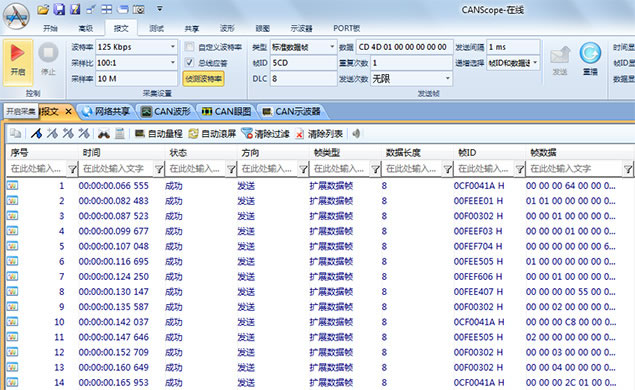 1.將儀器測試頭接入被測系統(tǒng)CAN總線,打開CANScope軟件,選擇正確的波特率,啟動。如果正確連接與設(shè)置,將會有數(shù)據(jù)出現(xiàn),如圖 2所示;