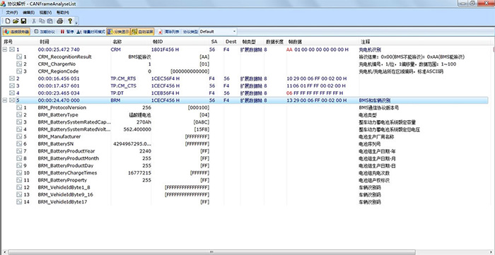 CANScope支持各種車載CAN-bus應(yīng)用協(xié)議的解析,只要用戶在CANtest軟件中導(dǎo)入相關(guān)的DBC文件,即可實現(xiàn)應(yīng)用層數(shù)據(jù)的解析??捎糜谲囕vCAN協(xié)議解析、車輛測試維修、破解車輛CAN協(xié)議等。特別是支持國網(wǎng)充電樁與電動汽車BMS(電池管理系統(tǒng))的通訊協(xié)議解析與驗證,只要用戶將CANScope接入被測系統(tǒng),即可實現(xiàn)協(xié)議數(shù)據(jù)的解析。如圖 1所示。
