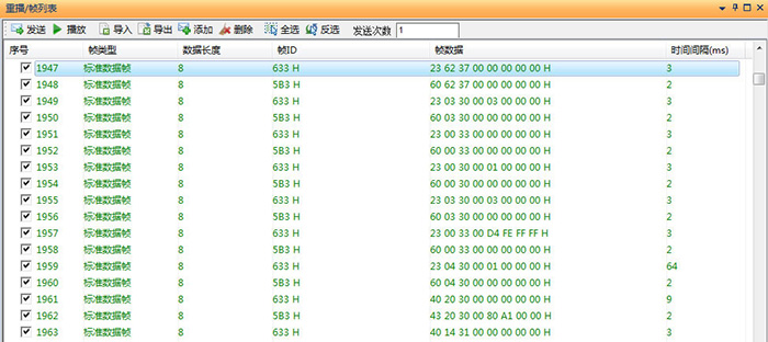 然后重播復(fù)現(xiàn)控制時序:點(diǎn)擊CANScope軟件的重播功能 ,可以看到每個控制報文與應(yīng)答報文的邏輯順序與時間間隔都清晰呈現(xiàn)。點(diǎn)擊播放后,可仿真原總線時序發(fā)送出來。并且可以多次重復(fù)仿真,無需原測試對象。如圖 8所示。