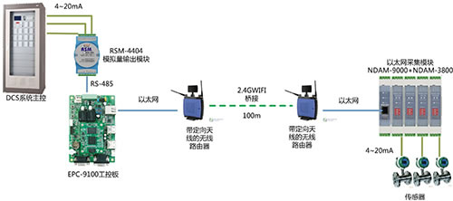 本方案即通過以太網(wǎng)數(shù)據(jù)采集模塊,將傳感器的4-20mA信號采集,然后通過帶定向天線的無線路由器進行遠(yuǎn)距離無線傳輸。在DCS系統(tǒng)主控側(cè)的EPC-9100通過以太網(wǎng)口也與一臺帶定向天線的無線路由器連接,這兩臺無線路由器通過AP橋接的方式實現(xiàn)數(shù)據(jù)互聯(lián)。