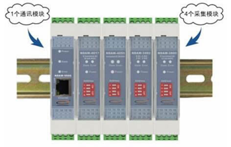 NDAM的模塊分為通訊模塊和采集模塊兩大類。通訊模塊可選以太網(wǎng)、CAN-bus或RS-485/422/232等通訊方式。1個通訊模塊最多可與8個采集模塊組合,組合之后成為一個分布式采集終端。下圖所示的就是1個以太網(wǎng)通訊模塊與4個采集模塊組合。
