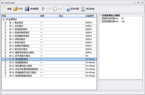 比如總線短路測試,CANScope可以模擬短路20ms(可自定義),然后檢測被測設(shè)備能否在100ms內(nèi)恢復(fù),以此驗(yàn)證被測設(shè)備是否有錯(cuò)誤處理恢復(fù)機(jī)制。