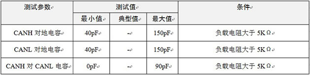 汽車CAN總線設(shè)計規(guī)范對于CAN節(jié)點的輸入電容有著嚴(yán)格的規(guī)定,每個節(jié)點不允許添加過多容性器件,否則節(jié)點組合到一起后,會導(dǎo)致總線波形畸變,通訊錯誤增加。具體如表 1所示,為汽車測試標(biāo)準(zhǔn)GMW3122中的輸入電容標(biāo)準(zhǔn)。