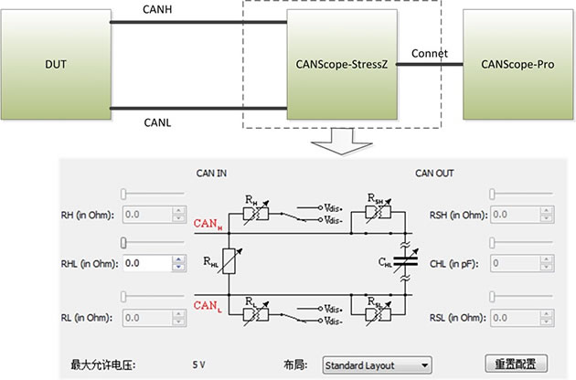 所以廣州致遠(yuǎn)電子股份有限公司改進(jìn)了測試方法,使用CANScope-Pro總線分析儀與CANScope-StressZ擴展板組合后,發(fā)送測試波形為正弦波,測試精度要比方波要高。不會受到收發(fā)器內(nèi)阻與線纜的影響,無需使用負(fù)載電阻。并且可以自動測量,減少了人工誤差和工作量。