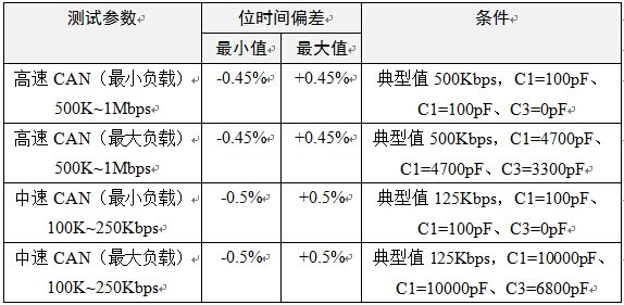 汽車CAN總線設(shè)計(jì)規(guī)范對(duì)于CAN節(jié)點(diǎn)的差分信號(hào)位時(shí)間(即波特率)有著嚴(yán)格的規(guī)定,同一總線上每個(gè)節(jié)點(diǎn)的信號(hào)位時(shí)間必須保持較高的一致性,否則節(jié)點(diǎn)組合到一起后,會(huì)導(dǎo)致錯(cuò)誤幀的出現(xiàn),各節(jié)點(diǎn)間無法進(jìn)行通信。具體要求如表 1所示,為汽車測試標(biāo)準(zhǔn)GMW3122信號(hào)位時(shí)間標(biāo)準(zhǔn)。