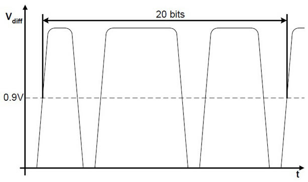 如表 1所示四種條件下,選擇被測DUT的適應(yīng)條件,使用示波器,通過測試DUT連續(xù)20-30個(gè)位的隱性-顯性差分電平的邊沿時(shí)間,平均計(jì)算出一個(gè)位的時(shí)間,并至少重復(fù)100次,確定最大和最小值。如圖 1所示。