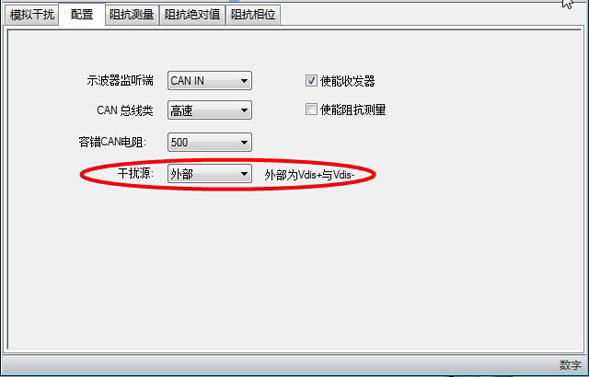 2. 配置干擾源為外部,如圖 3所示,便于啟用Vdis+和Vdis-的外部輸入接口。注意GND是在Vdis+和Vdis-外部輸入口中間那個(gè)接口,用于和CAN收發(fā)器的地連接。