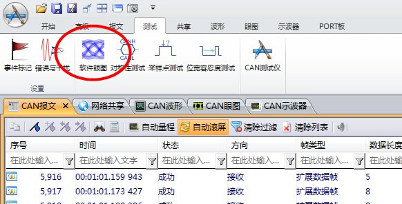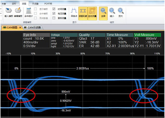 所以廣州致遠(yuǎn)電子有限公司改進(jìn)了測試方法,使用CANScope-Pro總線分析儀與CANScope-StressZ擴(kuò)展板組合后,采用比較先進(jìn)的眼圖統(tǒng)計(jì)方法,避免了人工統(tǒng)計(jì)的誤差,測試時(shí)間的浪費(fèi),且使大數(shù)據(jù)量統(tǒng)計(jì)測量得以實(shí)現(xiàn),提高了測試的準(zhǔn)確度,極大節(jié)約了人工成本。