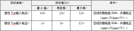 CAN總線設(shè)計規(guī)范對于CAN節(jié)點的輸入電壓閾值有著嚴(yán)格的規(guī)定,如果節(jié)點的輸入電壓閾值不符合規(guī)范,則在現(xiàn)場組網(wǎng)后容易出現(xiàn)不正常的工作狀態(tài),各節(jié)點間出現(xiàn)通信故障。具體要求如表1所示,為測試標(biāo)準(zhǔn)“ISO 11898-2輸出電壓標(biāo)準(zhǔn)”。