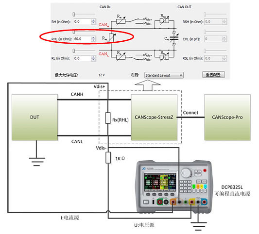 1、如圖2所示,進(jìn)行測試連接。調(diào)整CANScope-StressZ模擬擴(kuò)展板上的RHL值為60Ω,RH和RL為0Ω。使DUT主動發(fā)送CAN報文,CANScope不勾選總線應(yīng)答,黑色表筆(地)要和DUT的CAN收發(fā)器共地。