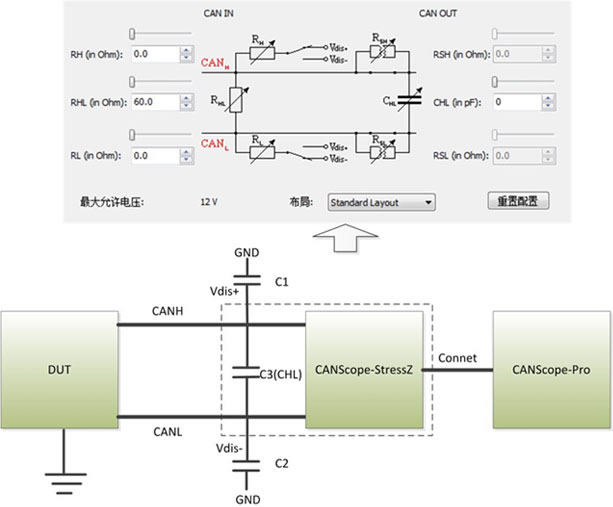 將Vdis+和GND、Vdis-和GND間各接入表 1所要求的C1、C2電容,調(diào)整CANScope-StressZ的控制面板將CHL調(diào)節(jié)為表 1所要求的C3電容。然后啟動CANScope-StressZ。