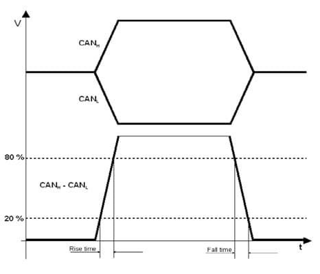 上升時間:從隱性到顯性狀態(tài)過渡時間。下降時間:從顯性向隱性狀態(tài)過渡時間。進行測量時,每個邊沿至少測量1000次,以確定邊緣上升/下降時間的最小值和最大值。