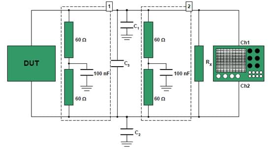 如表1所示電容匹配的條件下,選擇被測DUT的適應(yīng)條件,如圖2所示,測試接線小于1米,測試被測DUT的信號差分電平Vdiff=VCANH-VCANL的上升時間和下降時間(電壓20%~80%的區(qū)間)。