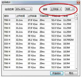 4、將DUT啟動,發(fā)送報文,通過CANScope記錄一段時間報文和波形后,點擊CANScope的停止,點擊工具欄中的邊沿統(tǒng)計。如圖5所示。