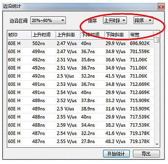 6、點擊排序為上升時間,升序排列中,第一條為上升時間最小值,如圖 6所示,為31.1ns;降序排列中,第一條為上升時間最大值,如圖7所示。同理,可以分析出下降時間的最小值,和最大值。