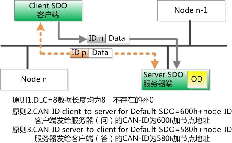 SDO的通訊原則非常單一,發(fā)送方(客戶端)發(fā)送CAN-ID為600h+Node-ID的報(bào)文,其中Node-ID為接收方(服務(wù)器)的節(jié)點(diǎn)地址,數(shù)據(jù)長(zhǎng)度均為8字節(jié);