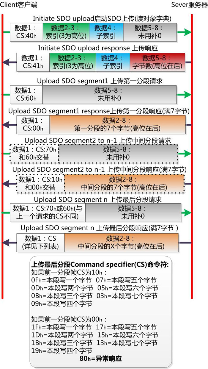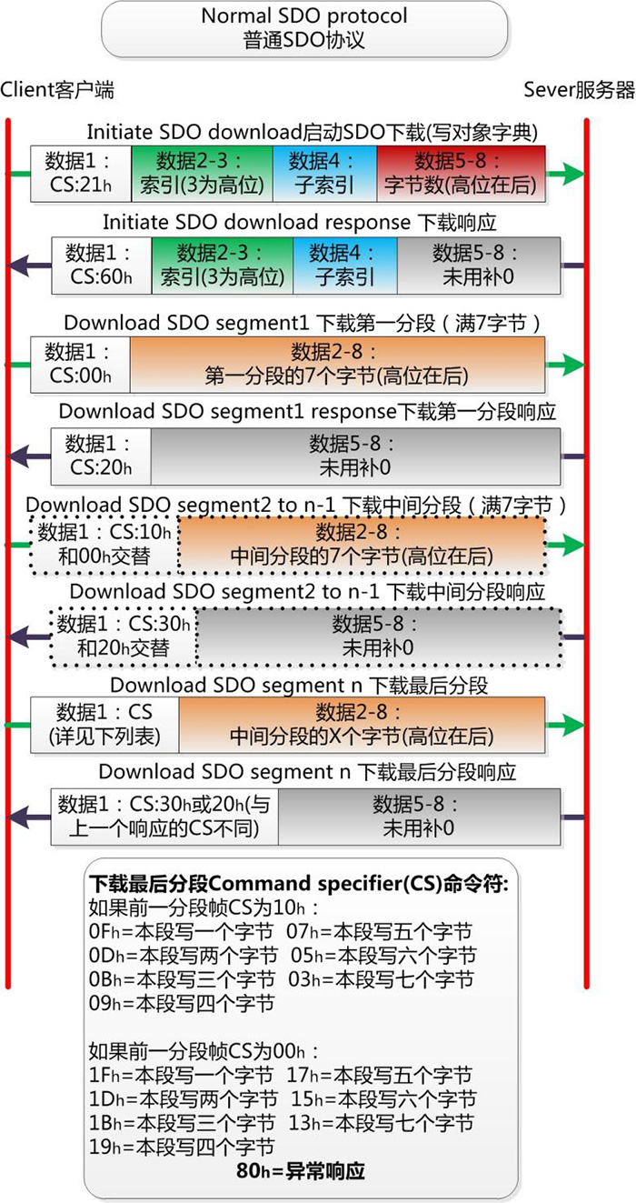 普通SDO協(xié)議難點(diǎn)在于分包邏輯與CS命令符的變化。依然難以記憶,需要讀者將以下示意圖進(jìn)行收藏。