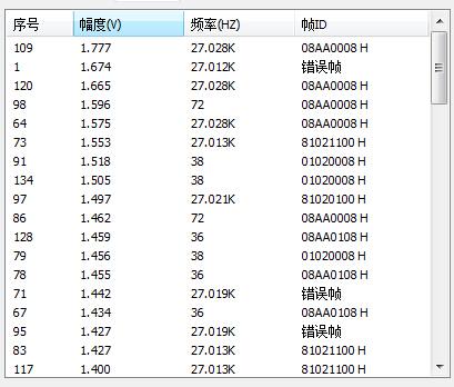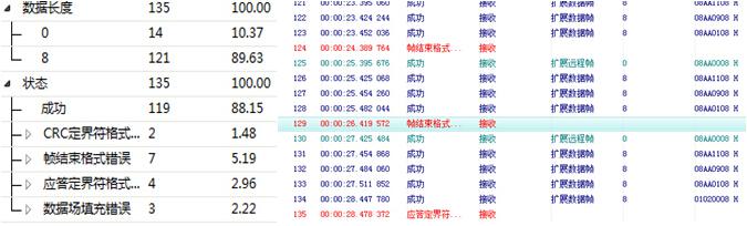 監(jiān)控系統(tǒng)上電工作后,記錄一段時間數(shù)據(jù),通過【報文幀統(tǒng)計功能】分析,此次測試樣本為135個幀,成功報文119個,正確率為88.15%。錯誤幀類型主要包括CRC定界符錯誤、幀結(jié)束錯誤、應(yīng)答定界符錯誤、數(shù)據(jù)場填充錯誤。使用CANScope分析儀輕松捕獲到網(wǎng)絡(luò)中的錯誤數(shù)據(jù),如圖2所示。