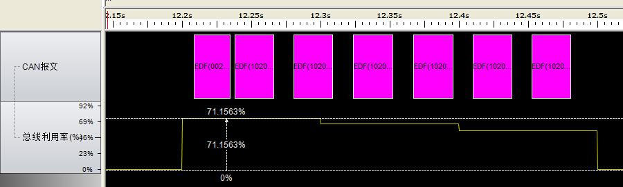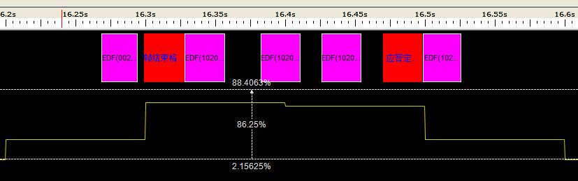 丟數(shù)據(jù)的周期中出現(xiàn)了紅色的錯誤幀,如圖4所示。有效報文數(shù)量=周期報文總數(shù)7-錯誤幀數(shù)量。我們都知道在正常模式下CAN總線中出現(xiàn)錯誤幀后底層會實現(xiàn)自動重發(fā),保證報文不會因為錯誤幀而丟失,然而在本網(wǎng)絡(luò)中這一機制未能實現(xiàn)。通過檢查軟件,發(fā)現(xiàn)軟件工程師在CAN控制器初始化代碼中禁用了重發(fā)功能,導(dǎo)致錯誤幀不能重發(fā)。
