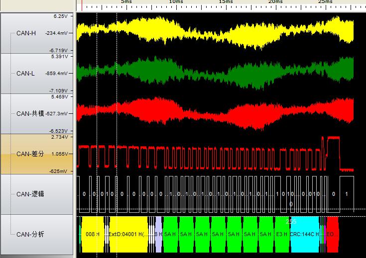 通過修改代碼解決了數(shù)據(jù)重發(fā)的問題,但是網(wǎng)絡(luò)中偶爾冒出的錯誤幀仍然是工程師的一塊心病,錯誤重發(fā)機制的使能僅僅是治標(biāo)不治本,那么究竟是什么原因?qū)е翪AN網(wǎng)絡(luò)中出現(xiàn)錯誤幀呢?這就需要借助CANScope的信號質(zhì)量分析功能。通過觀察錯誤幀的波形我們發(fā)現(xiàn),CAN信號上存在很嚴(yán)重的共模干擾,使得CAN_H和CAN_L上的單線波形畸變嚴(yán)重,如圖5所示。
