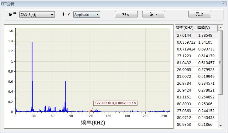 選取一條錯誤幀使用【FFT分析功能】進行分析可以看到該錯誤幀信號上的頻域特性,其中在27KHz頻點上存在很強的能量,幅值甚至達(dá)到了1.38V,如圖6所示。我們知道CAN總線的顯隱性電平的壓差很小,1V左右的干擾很容易導(dǎo)致電平識別錯誤,出現(xiàn)錯誤幀。