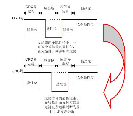 如果CAN的重同步不能彌補(bǔ)傳輸中所產(chǎn)生的延遲,就會(huì)導(dǎo)致應(yīng)答定界符的位寬變大,最終導(dǎo)致應(yīng)答定界符在識(shí)別過(guò)程中識(shí)別出錯(cuò),將隱性電平識(shí)別為顯性電平,出現(xiàn)定界符錯(cuò)誤。如圖1所示: