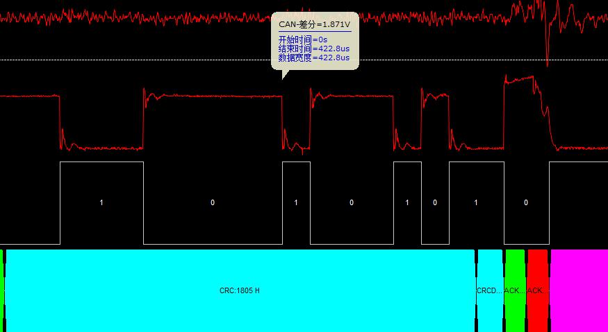 從數(shù)據(jù)我們可以看出,應(yīng)答定界符本應(yīng)該為隱性電平,但由于傳輸應(yīng)答的延遲問(wèn)題導(dǎo)致應(yīng)答定界符一直處在顯性狀態(tài),這導(dǎo)致應(yīng)答界定符格式出現(xiàn)錯(cuò)誤。