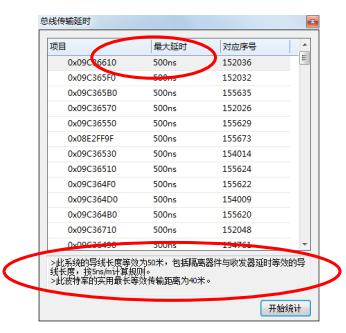 為了更快的進(jìn)行故障點(diǎn)的定位,我們首先要對(duì)整個(gè)通訊過(guò)程的延時(shí)狀況進(jìn)行分析,找出延時(shí)存在的地方。根據(jù)CANSCOPE中“傳輸延時(shí)”將整個(gè)列表以延時(shí)從大到小的順序?qū)⒀訒r(shí)排列出來(lái),以0.245倍位寬為界,超出該范圍可定義為有應(yīng)答錯(cuò)誤風(fēng)險(xiǎn)。