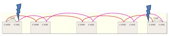由于總線(xiàn)上面掛接的節(jié)點(diǎn)距離測(cè)試點(diǎn)都不同,所以引起的延時(shí)都不一樣。我們?yōu)榱藱z測(cè)出總線(xiàn)最大的延時(shí),通常把測(cè)試點(diǎn)放在總線(xiàn)的最遠(yuǎn)兩端,測(cè)試的對(duì)象也是總線(xiàn)最遠(yuǎn)兩端的兩個(gè)節(jié)點(diǎn)發(fā)出來(lái)的報(bào)文。