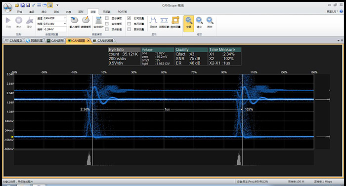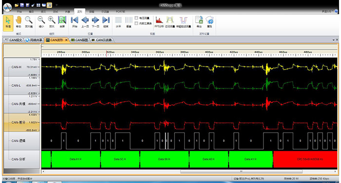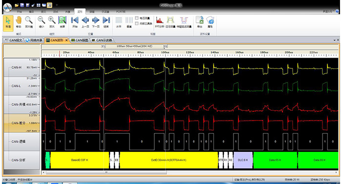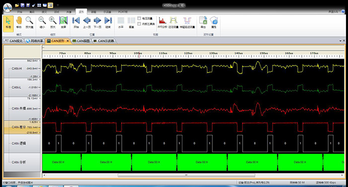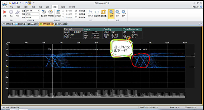 當(dāng)網(wǎng)絡(luò)中出現(xiàn)很多的錯(cuò)誤幀,大部分的原因是干擾造成的。受到干擾后CAN的波形如下圖所示,網(wǎng)橋的兩路CAN已經(jīng)在內(nèi)部做了隔離,所以利用網(wǎng)橋可以很好的隔離干擾源。