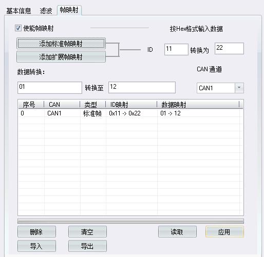 由于CANopen、j1939、充電樁通訊協(xié)議以及其他的應(yīng)用層協(xié)議比較復(fù)雜,數(shù)據(jù)幀定義種類繁多,在實(shí)際產(chǎn)品應(yīng)用中難免會(huì)遇到一些詭異報(bào)文。這種報(bào)文往往會(huì)讓其他節(jié)點(diǎn)誤動(dòng)作,這時(shí)候使用網(wǎng)橋的CAN報(bào)文映射功能,可以濾掉不想要的報(bào)文,而且還可以轉(zhuǎn)換報(bào)文。