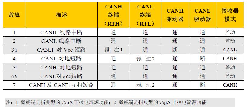 由圖中我們可以看出,CAN-H、CAN-L的電壓幅值在顯隱性發(fā)生變化時幅值變化高達4V,這樣不僅可以保證正常狀態(tài)下CAN總線的穩(wěn)定工作,還可以保證CAN總線中CAN-H、CAN-L其中一條發(fā)生故障(短路或者斷路)時,容錯CAN收發(fā)器會自動識別總線狀態(tài),根據(jù)總線狀態(tài)做出調(diào)整(具體見下表1),保證了CAN總線在故障時的通訊正常。