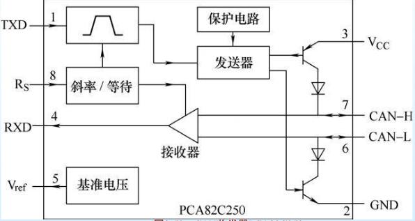 可以看出,與總線直接相連的是CAN節(jié)點的收發(fā)器,起內(nèi)部電路等效如下圖所示,CAN-H、CAN-L直接由三極管驅(qū)動,近似可以看成電流型輸出。結(jié)合上文所述網(wǎng)絡(luò)架構(gòu)中的終端電阻,節(jié)點發(fā)出信號時電流流過終端電阻產(chǎn)生電壓信號,當(dāng)同一時間多個節(jié)點同時發(fā)出信號時就會使總線上的電流高于單一節(jié)點發(fā)出的電流,使得我們觀察電壓信號時出現(xiàn)突增的現(xiàn)象。