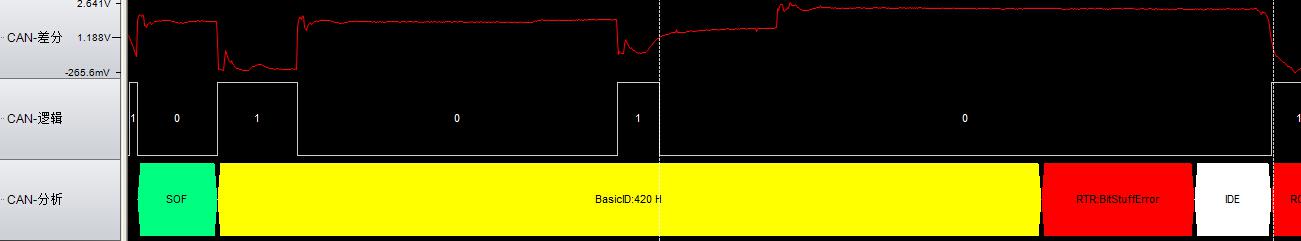 再看看這個案例,可以看到在波形的后半部分也出現(xiàn)了臺階式的幅值增高,光標(biāo)卡住的顯性電平區(qū)間可以看到寬度明顯超過了5個標(biāo)準(zhǔn)位寬,按照CAN總線的位填充規(guī)則(不能存在連續(xù)六個相同的顯性位或隱性位)表明這是一條錯誤幀。但是不要誤會,并不是因為這個幅值“異常”而導(dǎo)致的錯誤幀,我們知道CAN總線有錯誤重發(fā)機制,以保證總線傳輸數(shù)據(jù)的可靠性。這種可靠性正式通過錯誤幀的“一票否決制”實現(xiàn)的。當(dāng)網(wǎng)絡(luò)中某一節(jié)點識別到一條認(rèn)為是有問題的報文后會發(fā)送六個連續(xù)的顯性位(即錯誤幀),投出這一否決票通知網(wǎng)絡(luò)上所有其他節(jié)點,本條報文無效。此后其他節(jié)點會以“跟票”的形式全部發(fā)出六個顯性位錯誤幀。所以此時多個節(jié)點重疊部分的錯誤幀的幅值就會高一些了。