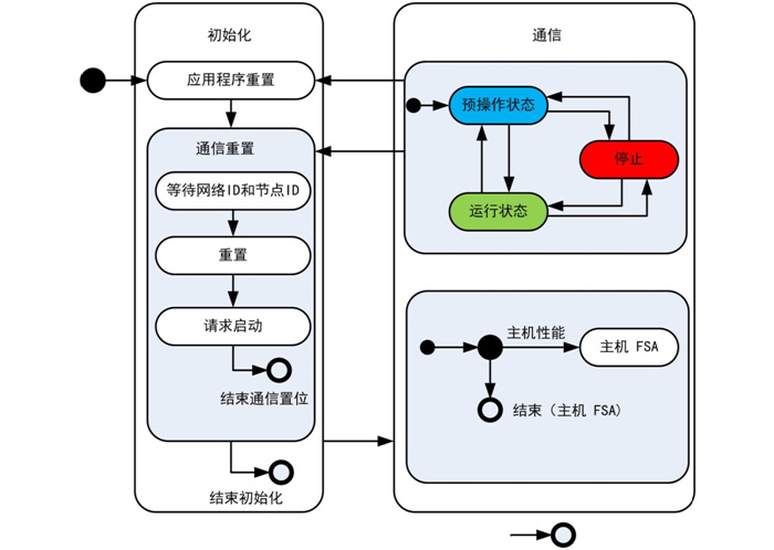 NMT從站狀態(tài)機(jī)由初始化狀態(tài),預(yù)操作狀態(tài),操作狀態(tài)和停止?fàn)顟B(tài)組成,其狀態(tài)轉(zhuǎn)換方式如圖1所示。