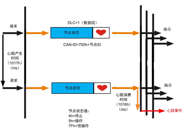 在CANopen FD網(wǎng)絡(luò)中通過錯(cuò)誤控制協(xié)議(如圖3啟動(dòng)協(xié)議、如圖4心跳協(xié)議)可以監(jiān)視CANopen FD設(shè)備是否仍在網(wǎng)絡(luò)中,并且處于預(yù)期的NMT FSA狀態(tài),同時(shí)也可以檢測到新加入網(wǎng)絡(luò)的CANopen FD設(shè)備。所有的CANopen FD設(shè)備都是基于相同的CAN FD信息,并具有CANopen FD設(shè)備的CAN-ID700H+節(jié)點(diǎn)ID。