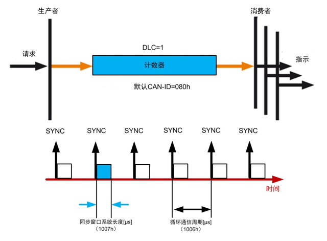 與CANopen相同,CANopen FD設(shè)備中,SYNC同步協(xié)議是由生產(chǎn)者定期發(fā)送,用于網(wǎng)絡(luò)同步。所有CANopenFD設(shè)備都可以作為SYNC的生產(chǎn)者。通常情況下,SYNC協(xié)議用作總線負(fù)載管理。SYNC報(bào)文提供1字節(jié)的SYNC計(jì)數(shù)器值。每次發(fā)送SYNC,對(duì)應(yīng)計(jì)數(shù)器就會(huì)加1。同時(shí),SYNC的傳輸周期是可以配置的,計(jì)數(shù)器初值為1,最大值可在數(shù)據(jù)對(duì)象同步計(jì)數(shù)器溢出寄存器(1019H)進(jìn)行配置,如圖6所示。
