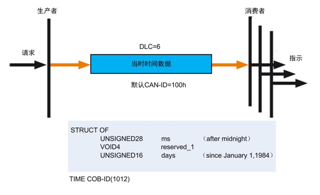 時(shí)間戳協(xié)議可以使CANopen FD系統(tǒng)調(diào)整到唯一的網(wǎng)絡(luò)時(shí)間。由CANopen FD主站設(shè)備發(fā)出,用于同步所有從站的內(nèi)部時(shí)鐘。時(shí)間戳被映射到一個(gè)6字節(jié)長度的CAN單幀。如圖7所示,默認(rèn)情況下,該CAN幀具有標(biāo)識(shí)符100h。這六字節(jié)長度的數(shù)據(jù)提供“時(shí)間“”信息,該信息是以午夜之后的毫秒數(shù)和自1984年1月1日以來的天數(shù)。