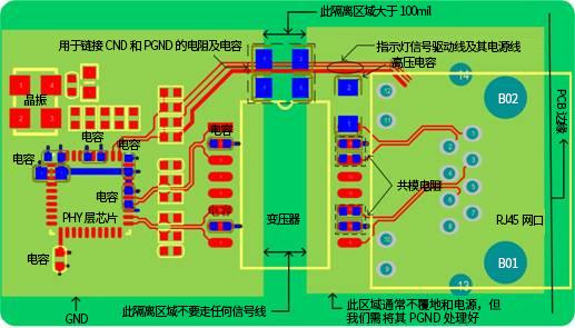 e) 變壓器的兩邊需要割地:即RJ45連接座和變壓器的次級線圈用單獨的隔離地,隔離區(qū)域100mil以上,且在這個隔離區(qū)域下沒有電源和地層存在。這樣做分割處理,就是為了達(dá)到初、次級的隔離,控制源端的干擾通過參考平面耦合到次級;