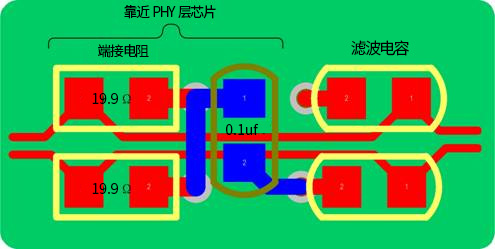 c)差分信號終端電阻(49.9Ω,有的PHY層芯片可能沒有)必須靠近PHY層芯片的Rx±、Tx±管腳放置,這樣能更好的消除通信電纜中的信號反射;
