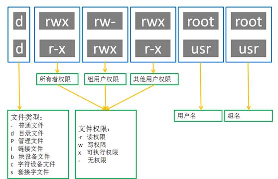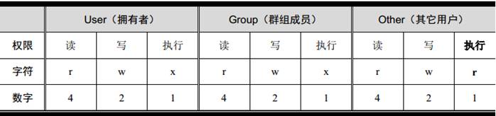 Linux系統(tǒng)對(duì)用戶的權(quán)限有著嚴(yán)格的管理。如圖3,可將一個(gè)文件的權(quán)限分為三部分:對(duì)文件所有者權(quán)限、對(duì)所有者所在用戶組權(quán)限、對(duì)其他用戶權(quán)限。其中,用戶組(group)就是具有相同特征的用戶的集合體。