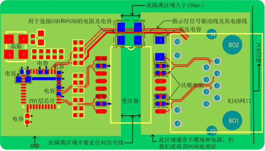 e)變壓器的兩邊需要割地:即RJ45連接座和變壓器的次級(jí)線圈用單獨(dú)的隔離地,隔離區(qū)域100mil以上,且在這個(gè)隔離區(qū)域下沒有電源和地層存在。這樣做分割處理,就是為了達(dá)到初、次級(jí)的隔離,控制源端的干擾通過(guò)參考平面耦合到次級(jí);