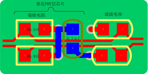 c)差分信號(hào)終端電阻(49.9Ω,有的PHY層芯片可能沒有)必須靠近PHY層芯片的Rx±、Tx±管腳放置,這樣能更好的消除通信電纜中的信號(hào)反射;