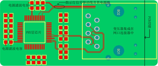 1.圖 2網(wǎng)口變壓器沒有集成在網(wǎng)口連接器里的參考電路PCB布局、布線圖,下面就以圖 2介紹以太網(wǎng)電路的布局、布線需注意的要點(diǎn)。