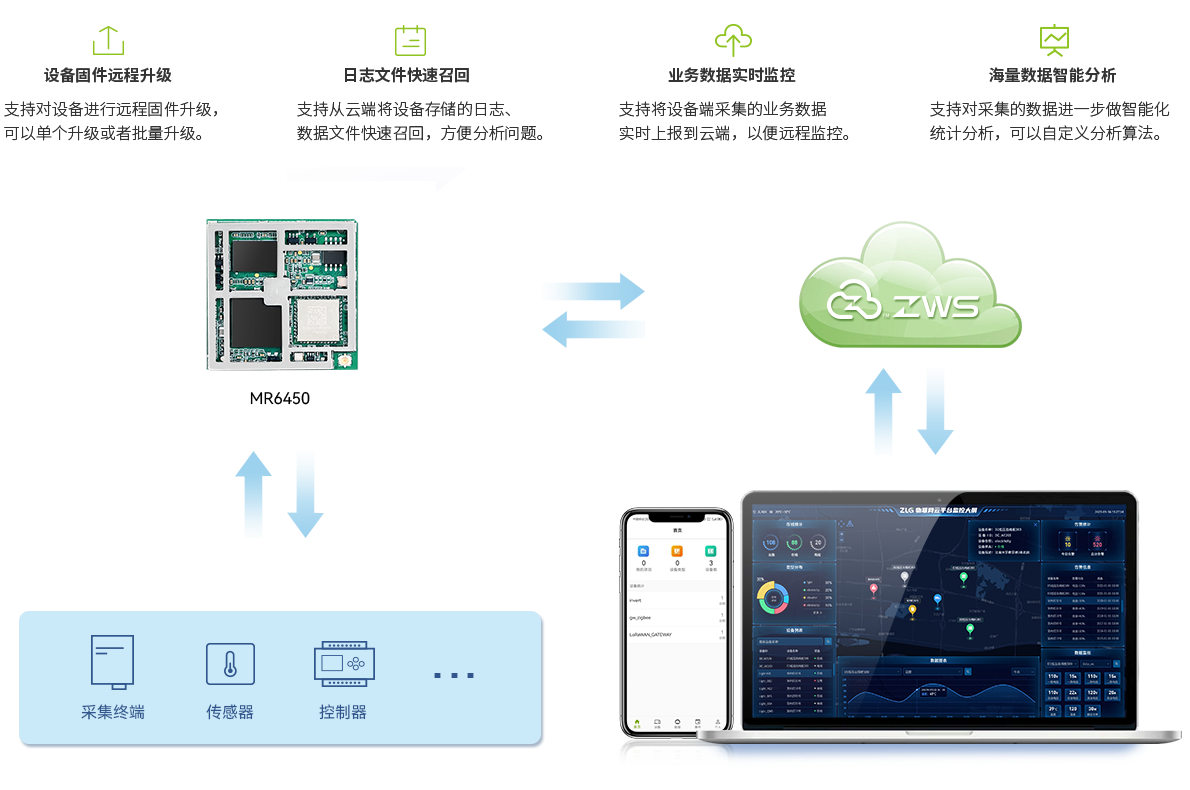 基于致遠電子自主研發(fā)的ZWS物聯(lián)網(wǎng)云平臺,讓設備實現(xiàn)智能化升級,支持遠程固件升級、日志文件快速召回、業(yè)務數(shù)據(jù)監(jiān)控、組態(tài)可視化呈現(xiàn)、海量數(shù)據(jù)分析等功能。
