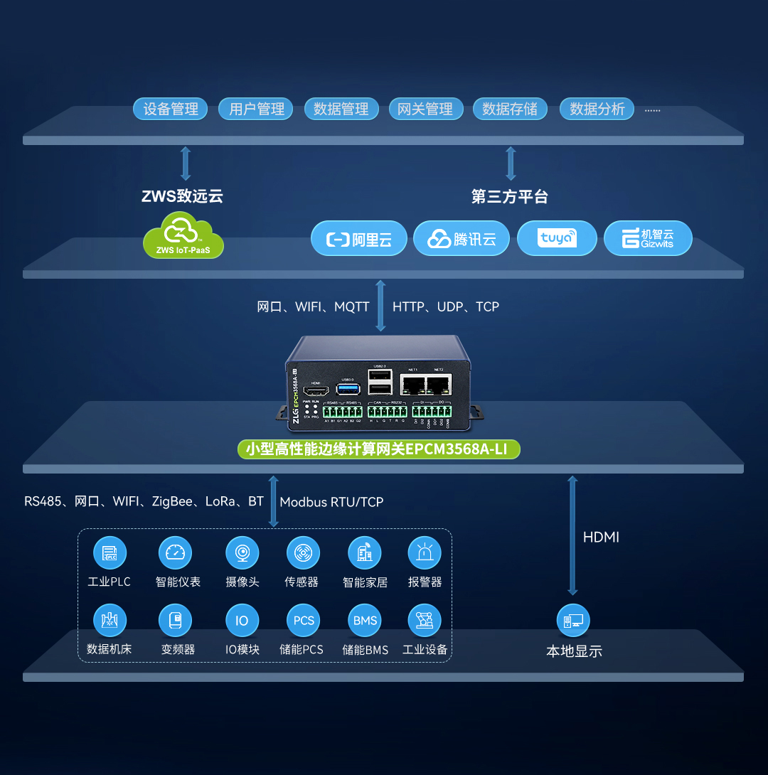 EPCM3568A-LI支持對接多種云平臺,實現云端與本地協(xié)同管理和控制。如:ZWS云、阿里云、騰訊云、涂鴉云、機智云等云平臺。默認支持致遠ZWS云接入。